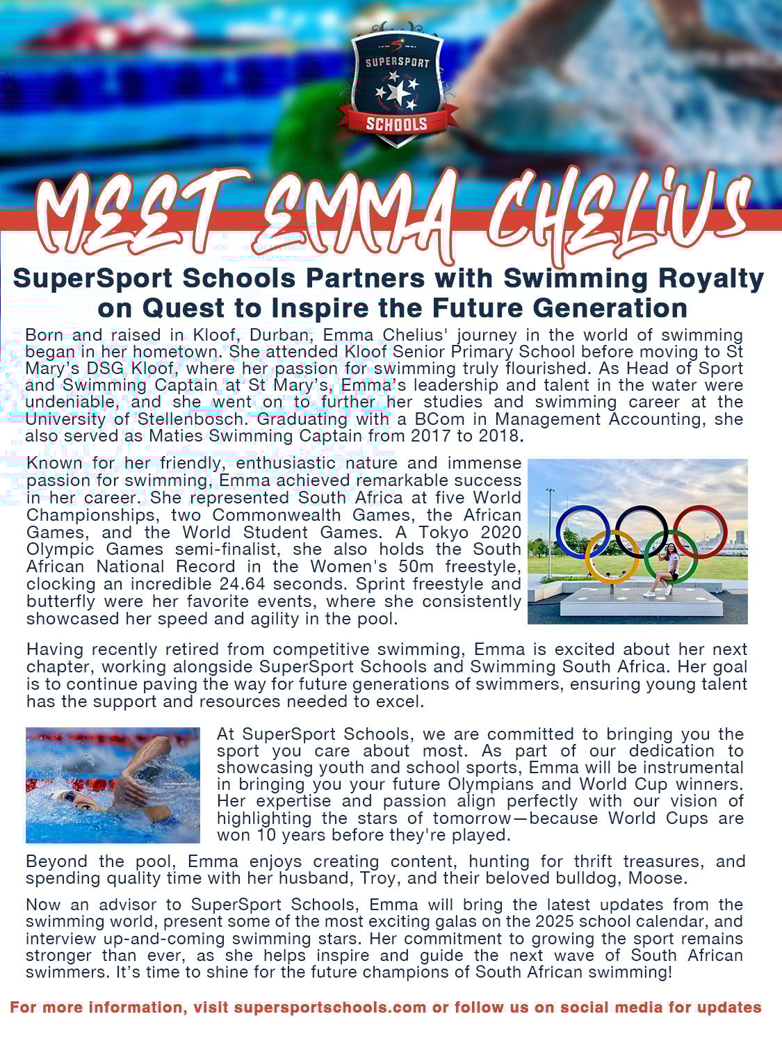 Emma, a Tokyo 2020 Olympic Games semi-finalist and South African Women's 50m freestyle record holder (24.64), has represented Team South Africa at five World Championships, two Commonwealth Games, the African Games, and the World Student Games. Known for her passion and dedication to swimming, Emma now joins SuperSport Schools to help inspire and pave the way for the next generation of swimmers. As the host of Swimming on 216 which will be launching in February next year, she will bring the latest updates from the youth Swimming and Water Polo world, showcasing the most exciting galas and tournaments on the 2025 school calendar, and highlight rising stars who are shaping the future of South African swimming. It’s time to shine for tomorrow’s champions!
