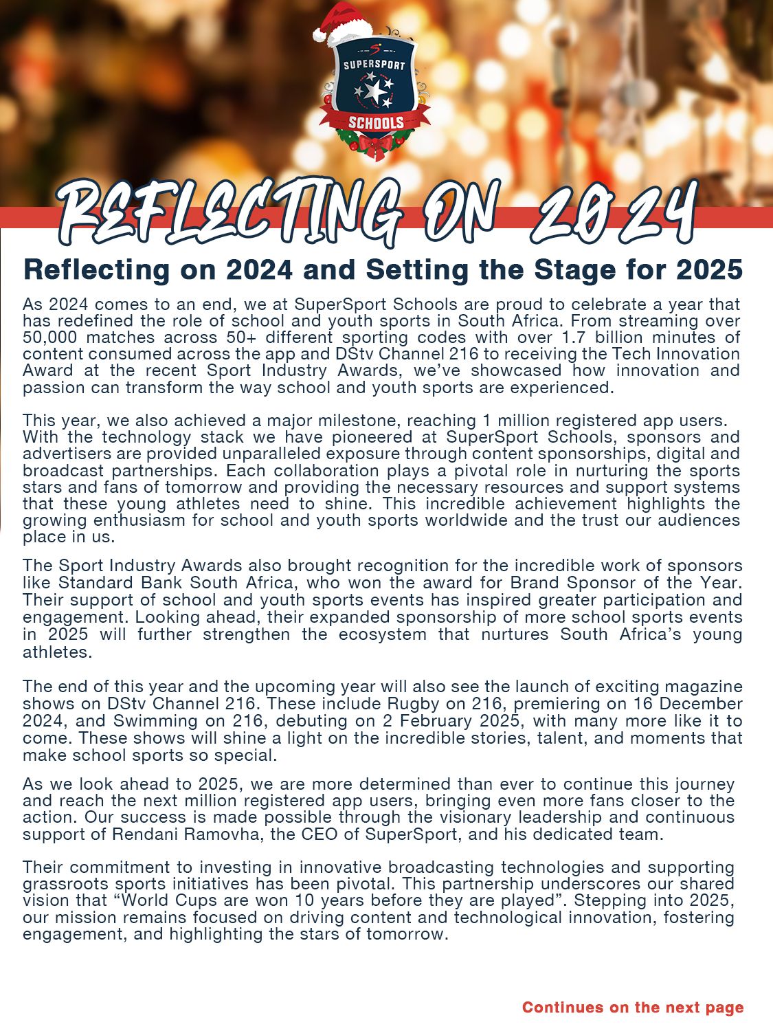 As 2024 comes to a close, SuperSport Schools proudly celebrates a year of milestones and innovation in school and youth sports. With over 50,000 matches streamed across 50+ sporting codes and 2.2 billion minutes of content consumed on our app and DStv Channel 216, we’ve redefined how these moments are experienced. This year, we also reached 1 million registered app users, a testament to the growing enthusiasm for school sports and the trust placed in us. Through cutting-edge technology and meaningful partnerships, we continue to provide unparalleled exposure for sponsors while nurturing the sports stars and fans of tomorrow..